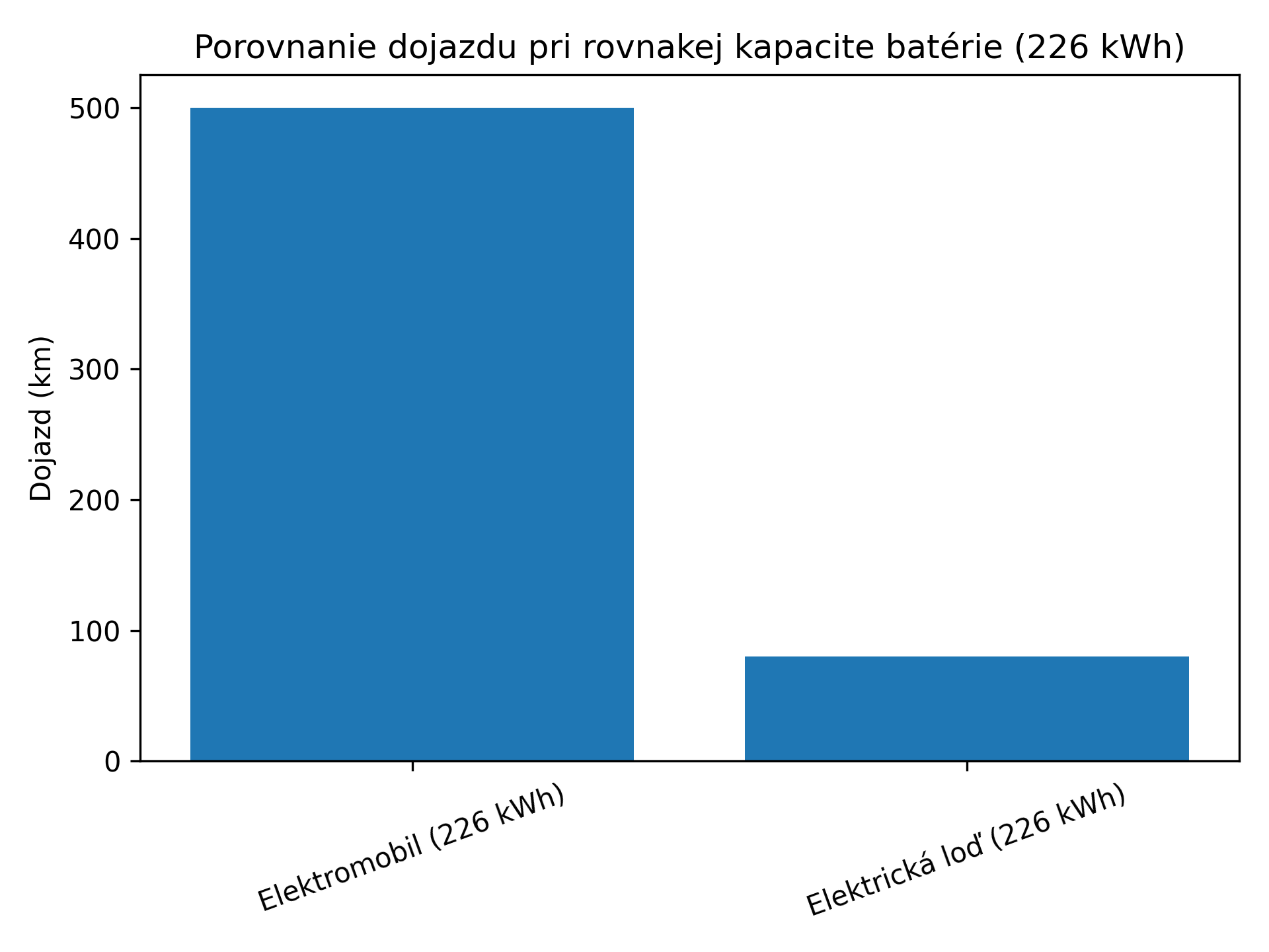 Loď s batériou 226 kWh môže prejsť približne 80 km. Elektromobil s rovnakou kapacitou prejde 450–550 km.