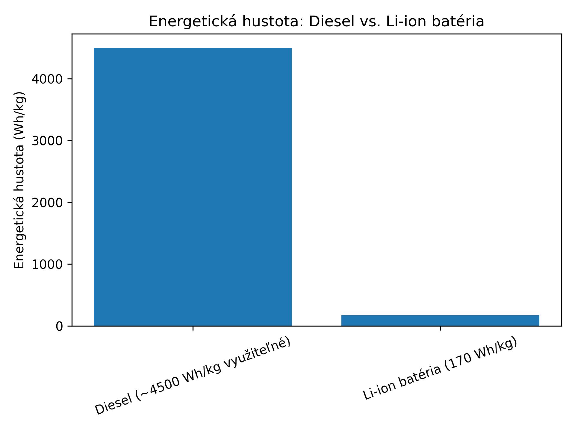 100 litrov nafty (~85 kg) obsahuje približne rovnaké množstvo využiteľnej energie ako 2–3 tony batérií.